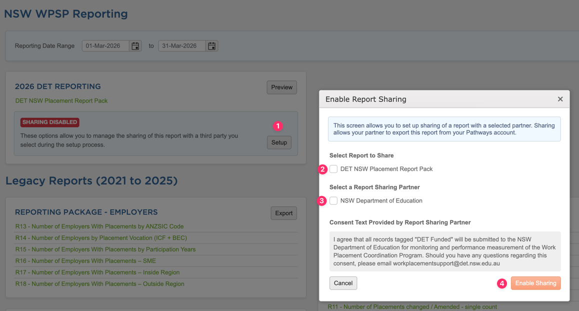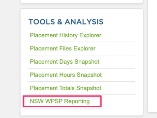 This report is available through your Pathways account via the Placements module — look for the NSW WPSP Reporting link. Report Sharing is a separate, optional feature and is covered later in this article.